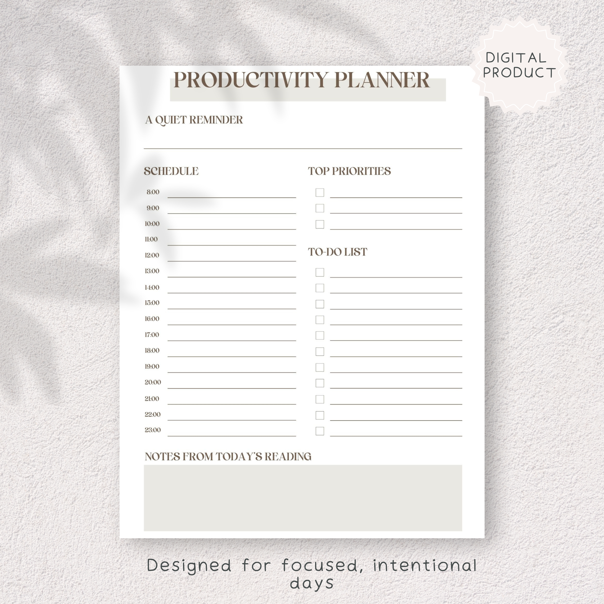 With a clear hourly schedule, space for top priorities, and a simple to-do list, this planner encourages mindful productivity rather than rushed task-checking. The “Quiet Reminder” section offers a moment of reflection before the day begins, while the dedicated notes area allows you to capture thoughts, ideas, or insights from your daily reading.
